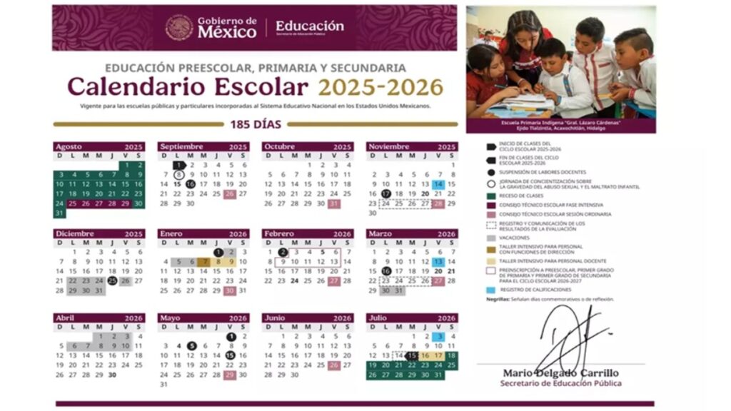 Además, el calendario incluye ocho sesiones ordinarias de Consejo Técnico Escolar: 26 de septiembre, 31 de octubre y 28 de noviembre de 2025; 30 de enero, 27 de febrero, 27 de marzo, 29 de mayo y 26 de junio de 2026.