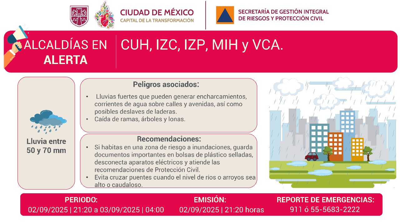 La Secretaría de Gestión Integral de Riesgos y Protección Civil (SGIRPC) activó la Alerta Roja por fuertes lluvias en las alcaldías Cuauhtémoc, Iztacalco, Iztapalapa, Miguel Hidalgo y Venustiano Carranza, debido a la persistencia de precipitaciones intensas que continuarán durante la noche del martes 2 de septiembre y la madrugada del miércoles 3. Las autoridades capitalinas recomendaron a la población extremar precauciones, mantenerse informada a través de los canales oficiales y atender las indicaciones de Protección Civil para evitar riesgos.