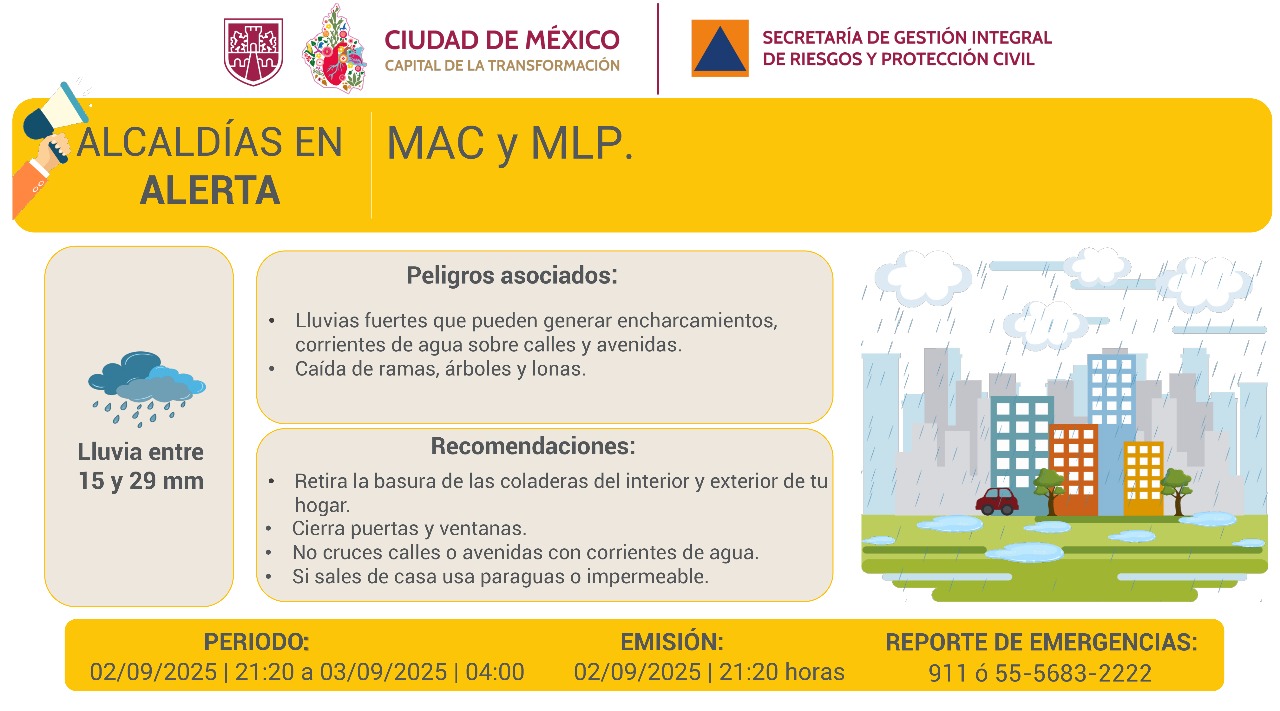 La Secretaría de Gestión Integral de Riesgos y Protección Civil (SGIRPC) activó la alerta naranja en las alcaldías Álvaro Obregón, Azcapotzalco, Benito Juárez, Coyoacán, Cuajimalpa, Tlalpan, Tláhuac y Xochimilco donde se espera la caída de lluvias más intensas a lo largo del día. Estas precipitaciones podrían presentarse de manera continua y estar acompañadas de descargas eléctricas y granizo en algunas zonas.