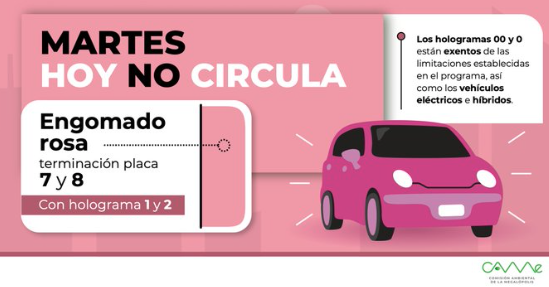 Este martes 9 de diciembre, el Hoy No Circula limita el tránsito de autos con engomado rosa, placas con terminación 7 u 8 y holograma 1 o 2. Estas unidades no pueden circular en la Ciudad de México ni en los 18 municipios del Estado de México que forman parte del programa.