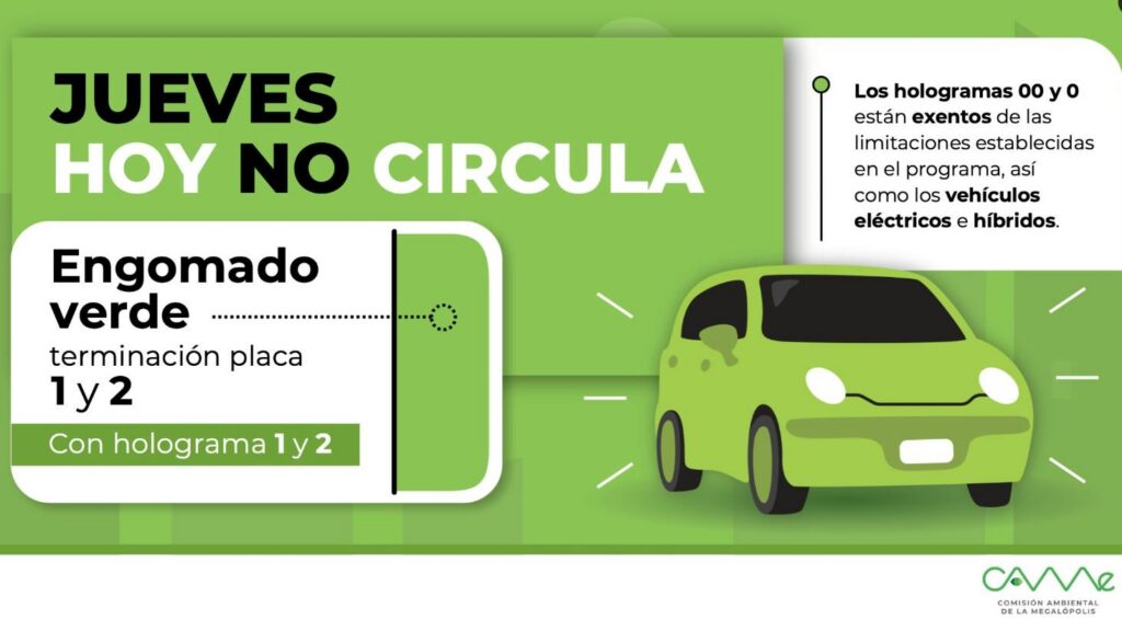 Este jueves 29 de enero no podrán circular los vehículos con engomado verde, terminación de placas 1 y 2 y holograma 1 o 2, dentro del horario establecido por el programa Hoy No Circula. Sin embargo, los vehículos con holograma 00 y 0, así como los automóviles eléctricos e híbridos, estarán exentos y podrán circular sin restricciones.