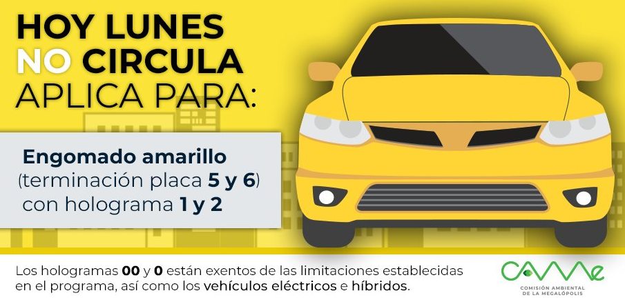 No circulan los autos particulares con engomado amarillo y terminación 5 o 6 que porten holograma 1 o 2. La medida abarca todas las alcaldías de la Ciudad de México y los municipios conurbados del Estado de México que forman parte de la ZMVM.