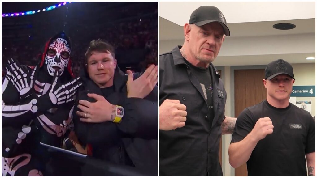 Horas antes, Canelo había ingresado a la zona de vestidores junto a su esposa e hijos. Durante ese recorrido se encontró con The Undertaker, histórico referente de la WWE y actual jefe creativo de Triple A, en un cruce que reunió a dos figuras emblemáticas de disciplinas distintas. En el mismo trayecto saludó a talentos ubicados en la parte alta del cartel, entre ellos Hijo del Vikingo, antes de dirigirse a su lugar en la grada.