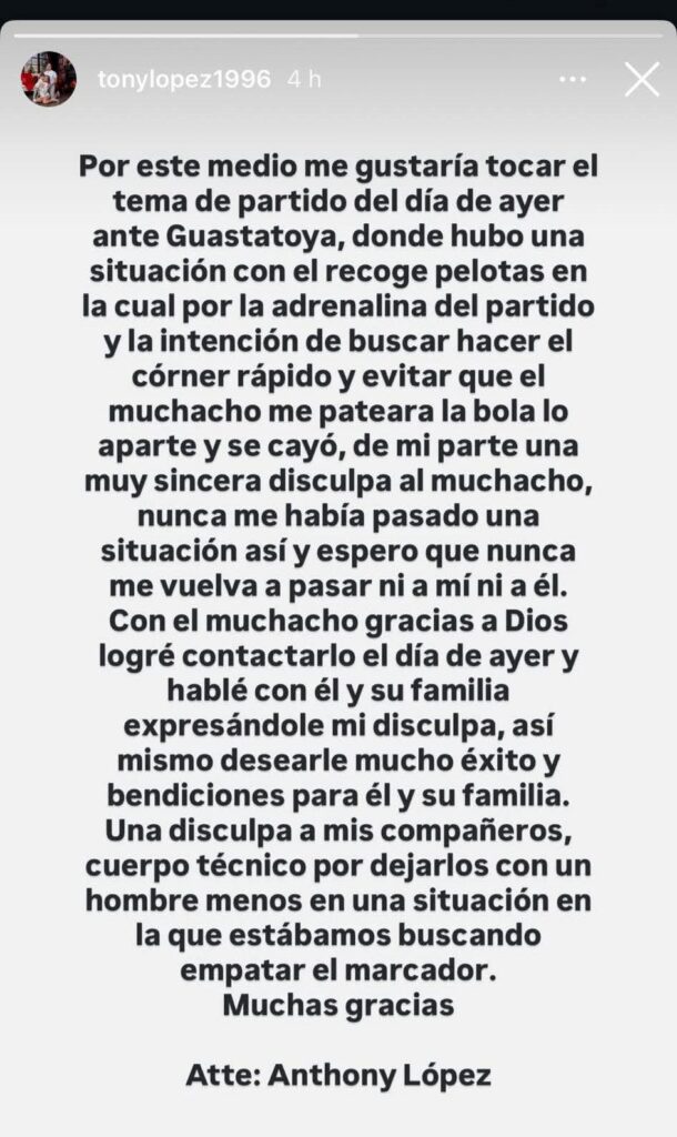 Anthony López ofreció disculpas públicas tras el incidente ocurrido en el partido entre Cobán Imperial y Deportivo Guastatoya, disputado en el estadio David Cordón Hichos por la Liga Nacional. El futbolista fue expulsado al minuto 82 luego de un altercado con un recogepelotas durante la recta final del encuentro.