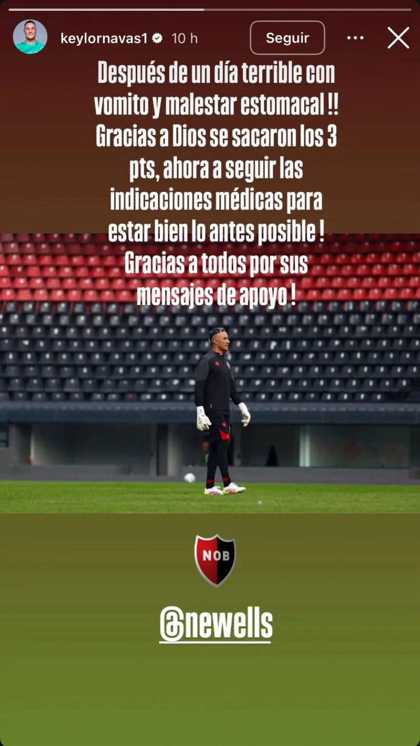 El propio Navas intentó aclarar su ausencia a través de Instagram: “Después de un día terrible con vómitos y malestar estomacal… Gracias a Dios se sacaron los tres puntos”.