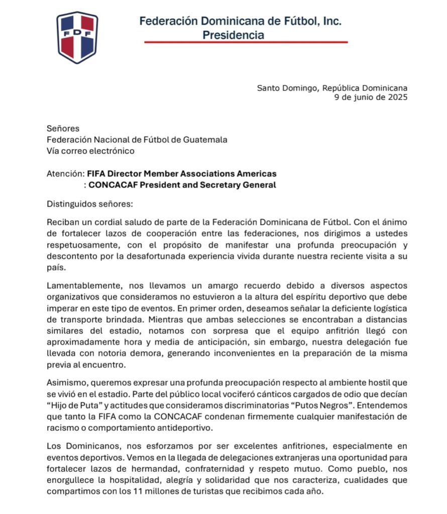 La Federación Dominicana de Fútbol expresó oficialmente su malestar por los hechos ocurridos durante su reciente visita a Guatemala, donde enfrentó a la selección local en el estadio Cementos Progreso. La inconformidad fue trasladada directamente a la Fedefut a través de una carta, con copias enviadas también a FIFA y Concacaf, dejando constancia de su disconformidad tanto con la organización como con el trato recibido.