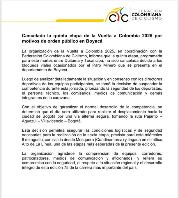 Por último, concluye: “Con el objetivo de garantizar el normal desarrollo de la competencia, se determinó que el día será utilizado para realizar el desplazamiento hacia la ciudad de Bogotá por una vía alterna segura. Esta decisión permitirá asegurar las condiciones logísticas y de seguridad necesarias para la realización de la sexta etapa, prevista para este miércoles 6 de agosto, con salida desde Mosquera (Cundinamarca) y llegada en el mítico Alto de La Línea, una de las etapas más esperadas de la presente edición”.