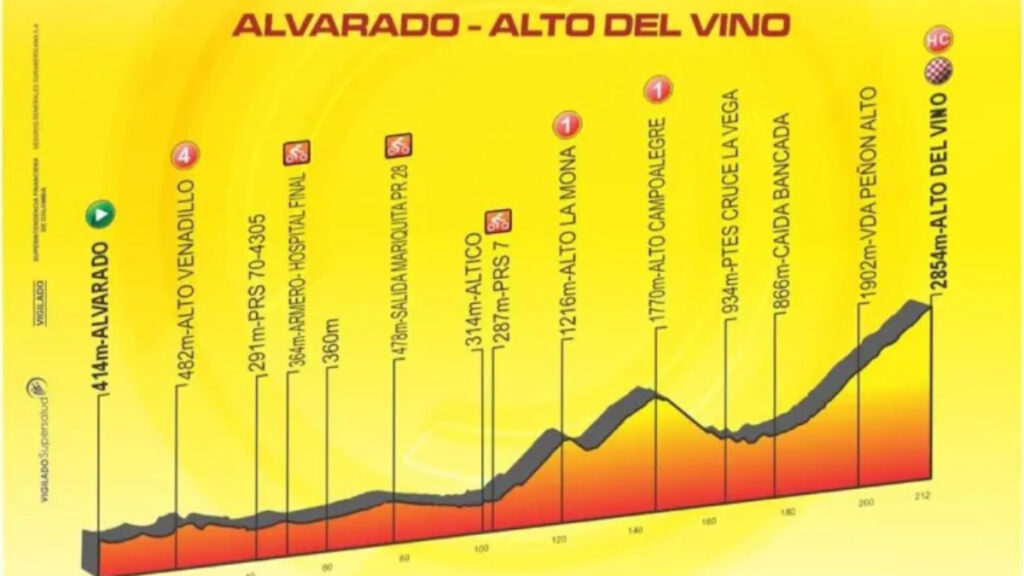 Regresa la montaña en la penúltima edición de la Vuelta a Colombia. Esta puede ser definitiva para un eventual trofeo de Rodrigo Contreras en la cima de la clasificación general; sin embargo, nada está dicho. Los corredores partirán de Alvarado al Alto del Vino, después de atravesar dos puertos de primera categoría y la cima especial.