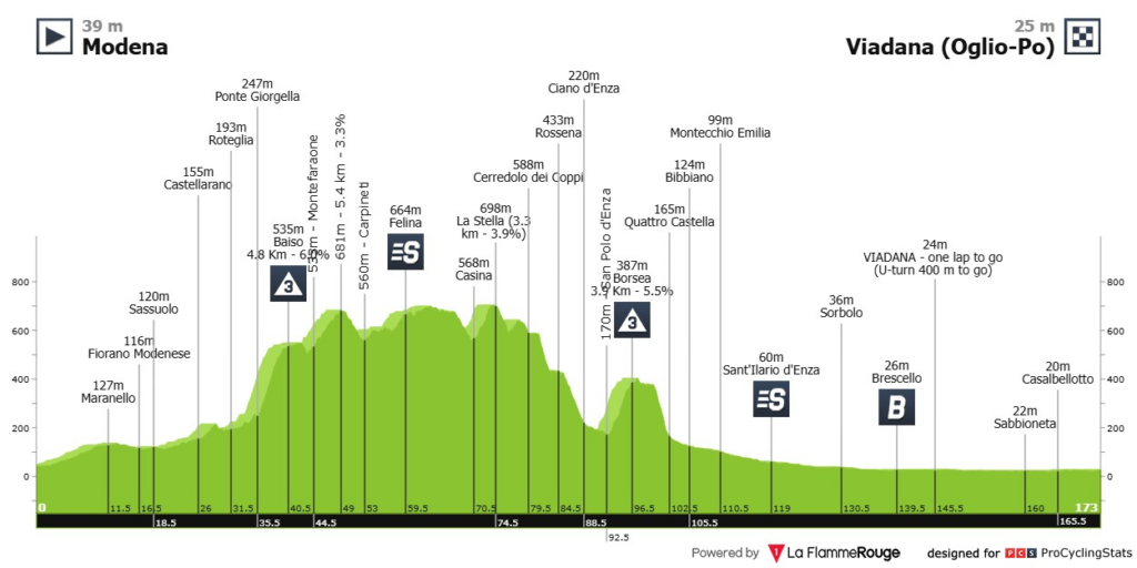 El día en Modena comenzará en ascenso. 40 kilómetros más adelante los participantes se encontrarán con un puerto de montaña de tercera categoría, después de haber superado otro pequeño tramo de montaña habrá un sprint. Luego se toparán con una bajada montañosa y tendrán que subir nuevamente para encarar otro puerto de montaña de tercera.