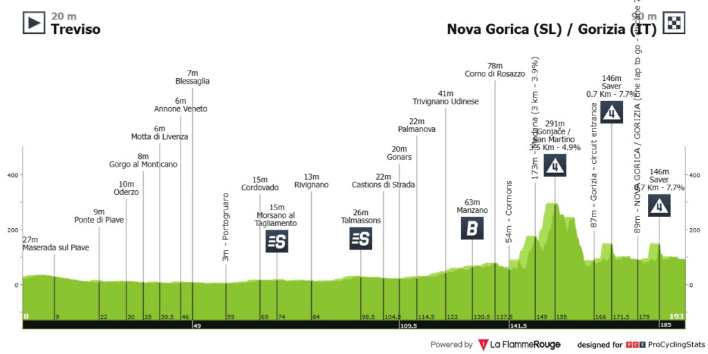 70 km | Situación de carrera: Todos los ciclistas se encuentran a 10 kms para encarar el tercer sprint del día, el cual se encuentra ubicado en Manzano. La fuga sigue liderada por Kasper Asgreen, Clément Davy, Mirco Maestri y Martín Marcellusi.