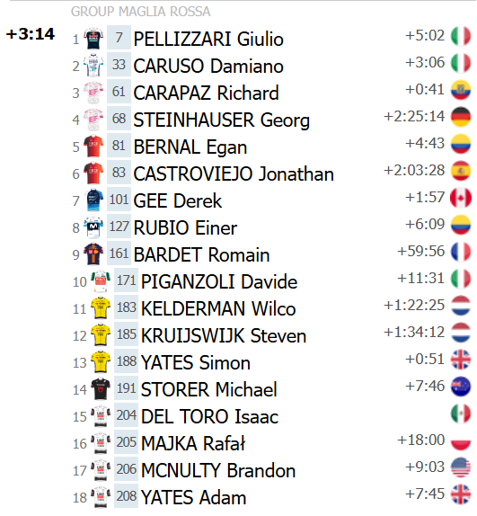 21 km | CARAPAZ SACUDE LA GENERAAAAAAAAAAAAAAAAL. Richard Carapaz sabe que es una de sus últimas oportunidades para ganar el Giro, por tal motivo el ecuatoriano se levanta de su bicicleta. Sin embargo es rápidamente atrapado nuevamente por Simon Yates e Isaac del Toro.