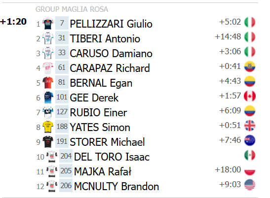 En cuanto a los ciclistas colombianos, Egan Bernal sigue siendo el que mejor se posiciona en la general, el zipaquereño es sexto a 4:43 de del Toro y Einer Rubio marcha octavo a 6:09.