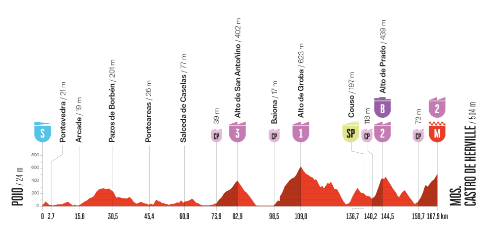 Serán cerca de 168 kilómetros que tendrán vértigo y emoción en la media montaña. Todo inicia en el esprint desde Poio. Exactamente en el ecuador de la fracción, los pedalistas ascenderán por picos pronunciados. El primero es el Atlo de San Antoniño (tercera categoría).