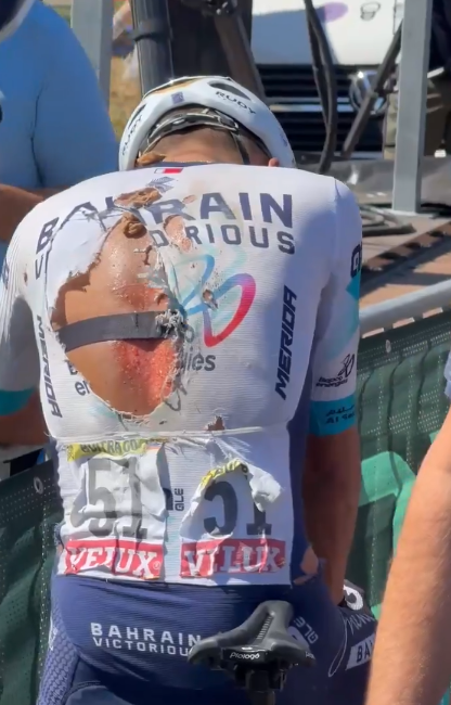 Así terminaba la espalda de Santiago Buitrago el pasado 11 de julio, en medio de la etapa 7 del Tour de Francia 2025. En el trayecto entre Saint-Malo y Mûr-de-Bretagne (Guerlédan) el colombiano se vio involucrado en una dura caída con Joao Almeida (UAE Team Emirates -XRG) sin embargo el portugués no aguantó las fracturas, heridas y días después le dijo adiós al a ronda ‘Gala’.