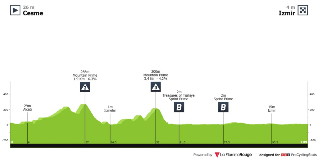 Este domingo 4 de mayo estará finalizando la 60° edición del Tour de Turquía. Serán 105 kilómetros entre Çeşme y İzmir (Karşıyaka). La jornada iniciará con un puerto de montaña de tercera categoría, al 53 nuevamente con otro, luego del descenso el resto del día será plan con dos sprints bonificables.