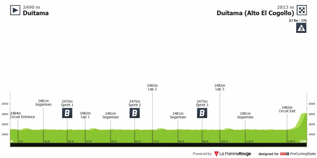 Tras haber iniciado su recorrido en Boyacá, en el municipio de Raquira, ahora la Vuelta se correrá este lunes en Duitama. Serán tres esprints bonificables en una etapa llana de 139 kilómetros, los 11 restantes para llegar a la meta serán con ascenso a un puerto de montaña de tercera categoría, el cual conducirá al reconocido Alto del Cogollo.