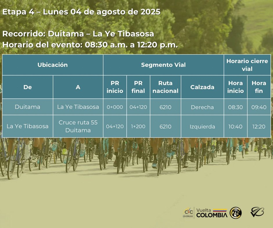 Cierres viales por la etapa 4 de la Vuelta a Colombia 2025
