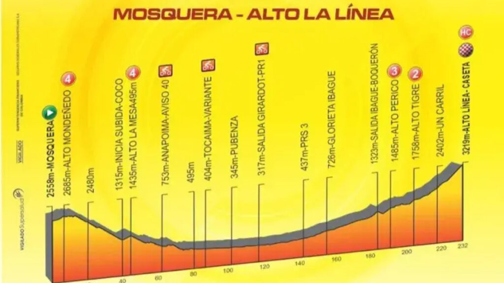 10:50 a.m. Bueno, lo que se avecina en la jornada es electrizante. Primero se va a coronar el Alto del Perico, un puerto de tercera categoría con una pendiente de 3,2 kms al 5,3 %. Posteriormente, será el turno del Alto del Tigre, un puerto de segunda categoría y presenta una altimetría de 2,4 kms al 10 %. Y, finalmente, el Alto de la Línea, 19,8 kilómetros al 6,9 %.