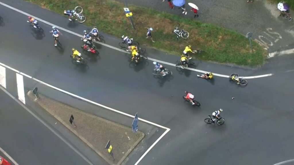 Caída en la cabeza del pelotón: afectados casi todos los Visma (incluido Vingegaard) y Pidcock.