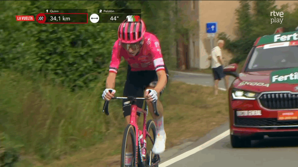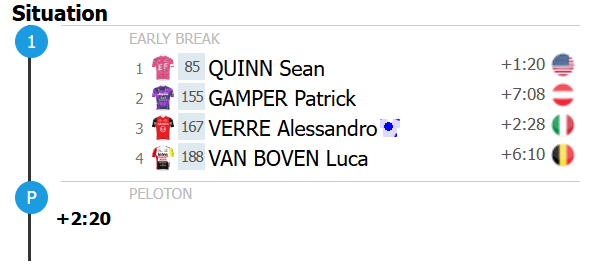35 km | Sean Quinn se escapa y lidera la fuga. El estadounidense del EF Education – EasyPost va por la victoria de etapa. El segundo grupo se encuentra a 0:44.