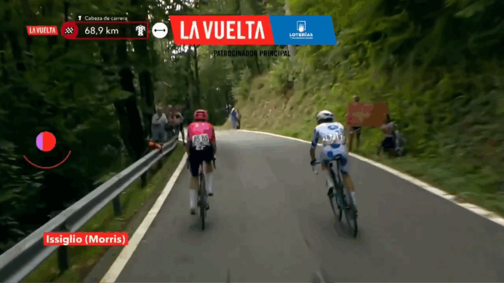 70 km | Para el encare del puerto de montaña de segunda categoría en Issiglio (Morris) se escapan dos ciclistas: Sean Quinn y Alessandro Verre van por los puntos que entregará este premio.