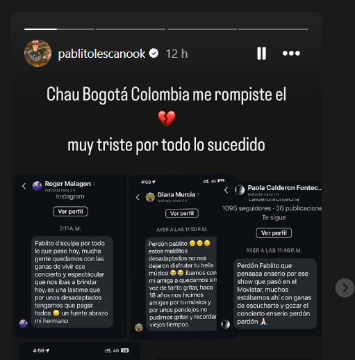 Después de no haber podido salir a dar su show, porque el concierto claramente fue cancelado, el líder de la banda argentina Pablo Lescano posteó un certero mensaje en su red social de Instagram: “Chau Bogotá, Colombia me rompiste el corazón, muy triste todo lo sucedido”, lamentando todo lo ocurrido en la capital de la República.