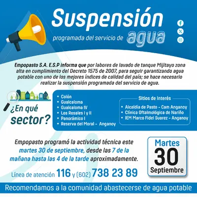 Guerra avisada no mata soldado. Y eso justamente es lo que ha llevado a cabo la empresa de obras sanitarias Empopasto, quien ha anunciado en las últimas horas la suspensión del servicio de agua potable en diferentes sectores de la ciudad, a lo largo de este martes, 30 de septiembre. A continuación, les detallamos el horario en el que se verá afectado el líquido y los barrios.