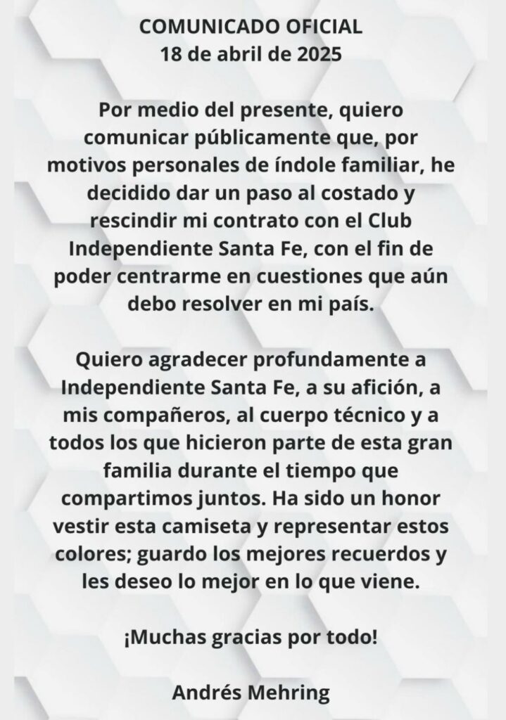 Mediante sus redes sociales, Andrés Mehring, se pronunció acerca de su renuncia a Independiente Santa Fe. “Por motivos personales de índole familiar, he decidido dar un paso al acostado y rescindir mi contrato con el club Independiente Santa Fe. Con el fin de poder centrarme en cuestiones que aún debo resolver en mi país” concluyó el ex portero ‘Cardenal’.