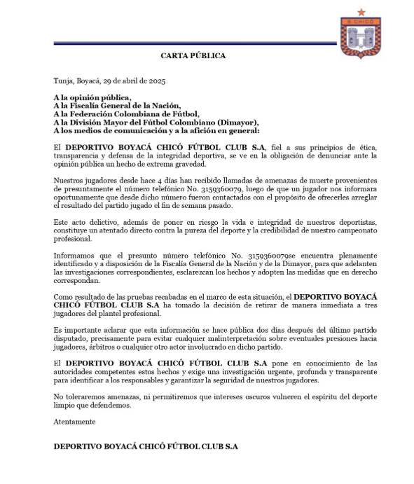 “El Boyacá Chicó pone en conocimiento de las autoridades competentes estos hechos y exige una investigación urgente, profunda y transparente para identificar a los responsables y garantizar la seguridad de nuestros jugadores. No toleraremos amenazas, ni permitiremos que intereses oscuros vulneren el espíritu del deporte limpio que defendemos”, complementó.