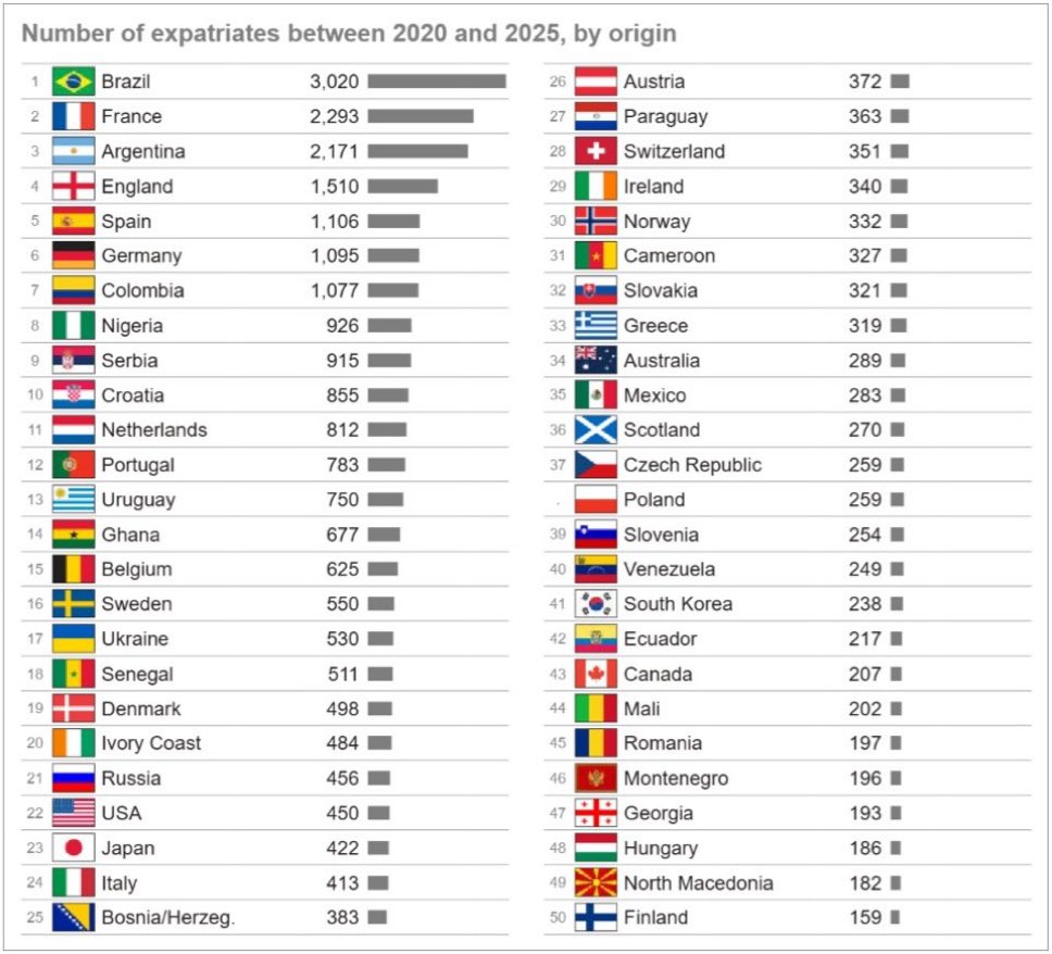 Brasil es el país que lidera el ranking con 3020 futbolistas exportados. Vale la pena recordar que, en este periodo de tiempo entran transferencias como la de Yaser Asprilla al Watford de Inglaterra, Daniel Muñoz al fútbol de Bélgica, Kevin Castaño al Cruz Azul de México y la de Jhon Jáder Durán al Chicago Fire, entre muchas otras más.