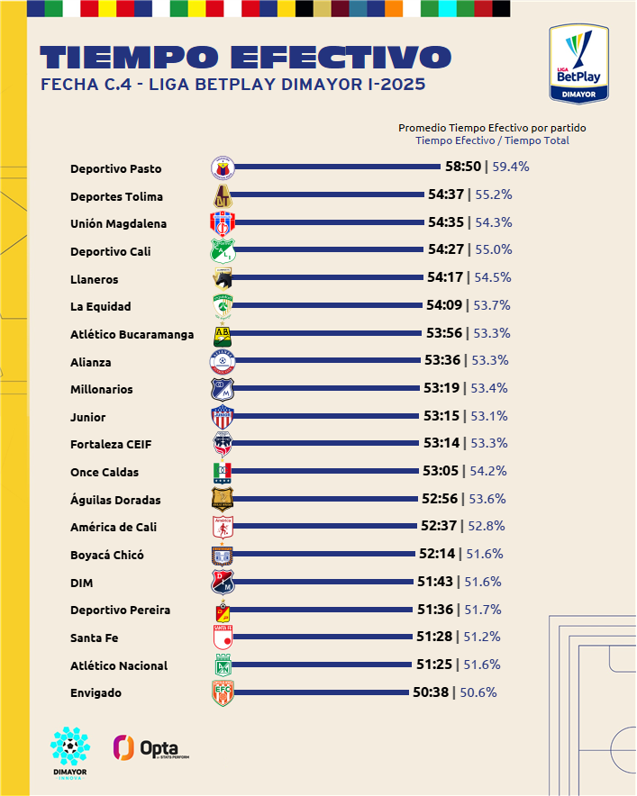 Deportivo Pasto es el club que mayor promedio de tiempo efectivo de juego tuvo a lo largo de la Liga BetPlay Dimayor 2025-I con un total de 58 minutos y 50 segundos. De los ocho clasificados a la fase semifinal del Fútbol Profesional Colombiano, el más cercano es el Deportes Tolima con 54 minutos y 37 segundos, de promedio.