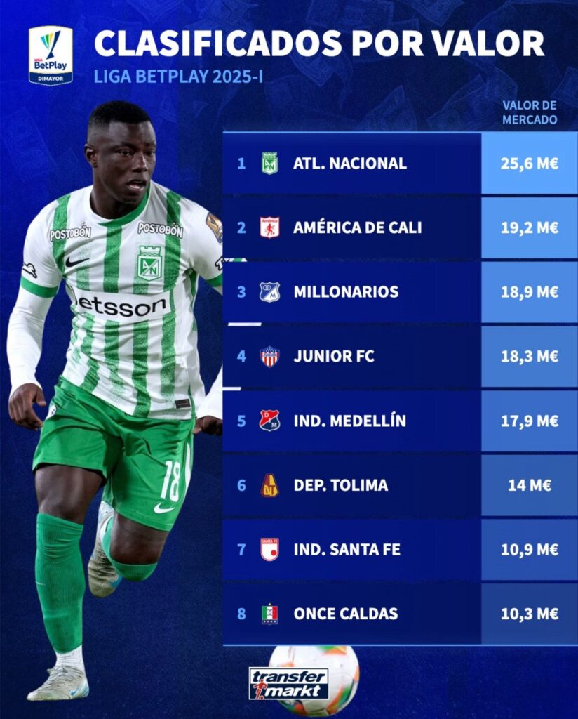 El portal especializado en valores de mercado del fútbol mundial ha revelado los costos de plantilla de los ocho mejores equipos de la Liga BetPlay Dimayor 2025-I. Atlético Nacional es, por lejos, el equipos mas valioso de Colombia con una valor de 25.6 millones de euros. Mientras que, Once Caldas de Manizales es el club con menor valor de plantilla; 10.3 millones de euros.