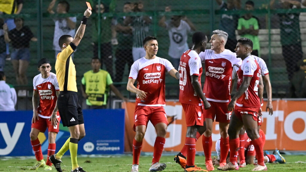Ni ganando ni clasificando hay tranquilidad en Independiente Santa Fe. A pesar de ratificarse en el grupo de los ocho tras superar 0-2 al Deportivo Cali, en el Coloso de Palmaseca, la noche no ha podido ser normal en el ‘León’, y todo después del bochornoso episodio que quedó captado entre Yílmar Velásquez y Harold Santiago Mosquera, luego del tanto de Edwar López. Una imagen que no necesita pie de foto.