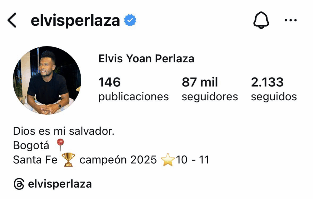 Pues bien, en la antesala del debut del ‘León’ en la Liga BetPlay 2025-II, en la que el equipo liderado por el presidente Eduardo Méndez, aseguró que van por el título de fin de año, el lateral derecho ya actualizó su cábala, así aparece ahora el perfil de Elvis en su cuenta de Instagram: “Santa Fe campeón 2025 10-11”.