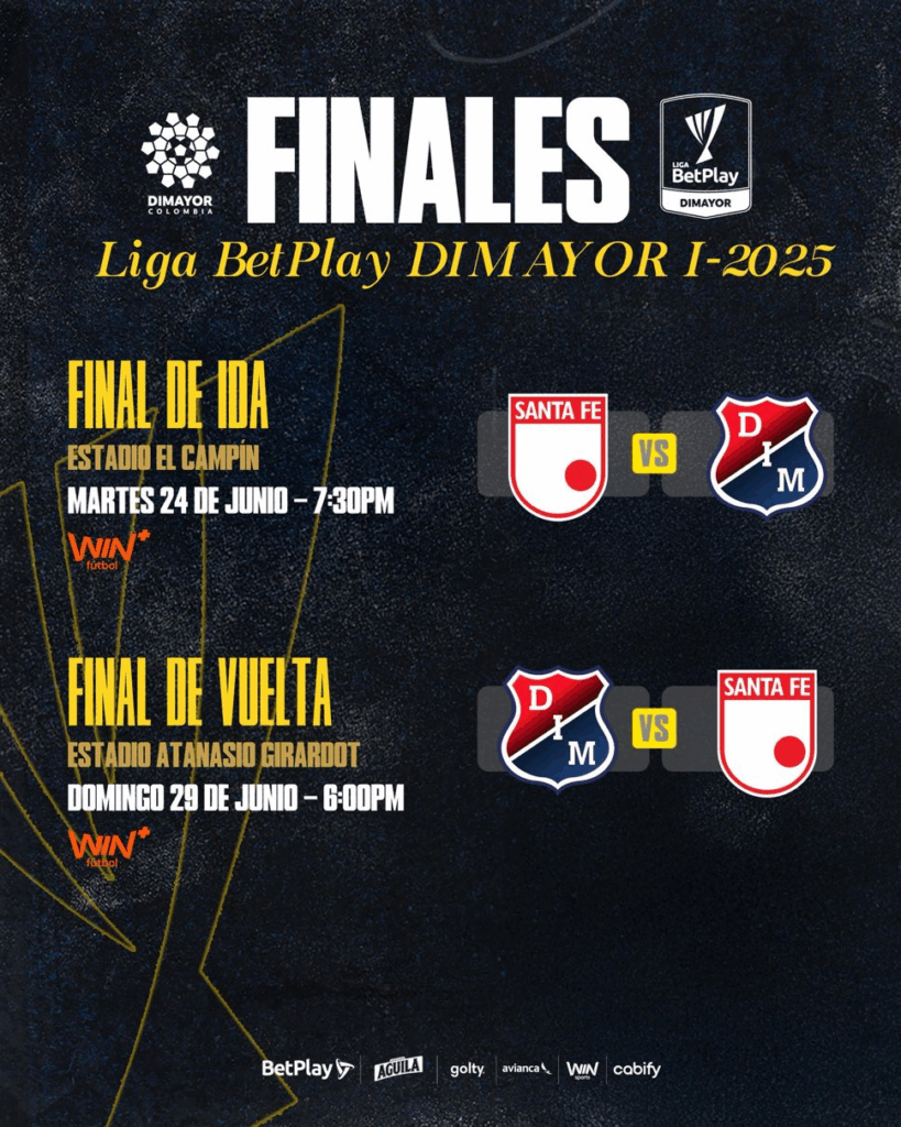La Dimayor hizo oficial las fechas y horarios de los partidos de ida y vuelta de la gran final. El primer sorbo será el martes 24 de junio en el Estadio Nemesio Camacho El Campín, a partir de las 7:30 p.m. Y el partido definitivo será en el Estadio Atanasio Girardot de Medellín, el domingo 29 de junio, a las 6:00 p.m.