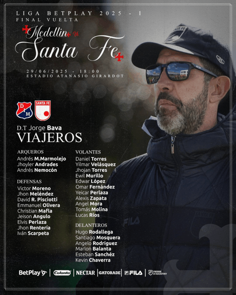 Independiente Santa Fe publicó este sábado el listado de los jugadores que viajaron para encarar el partido de vuelta de la final de la Liga BetPlay 2025-I ante Medellín. En la imagen se encuentran 29 futbolistas, el técnico Jorge Bava no le quiere dar ninguna señal al DIM de lo que planteará en el Atanasio Girardot.