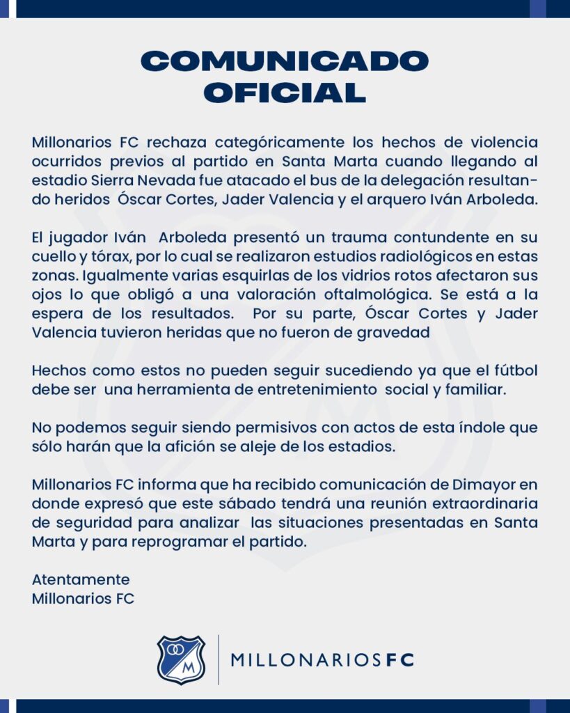 Horas después del percance, Millonarios emitió un comunicado informando lo sucedido. Aclaró que el jugador Jáder Valencia y el delegado Óscar Cortés también sufrieron heridas en medio del ataque, pero que no eran de mayor consideración. En lo que respecta a Iván Arboleda, se realizaron exámenes radiológicos y oftalmológicos de los que se esperan lo resultados.