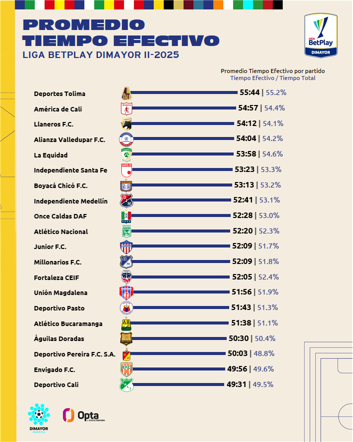 Para esta Liga BetPlay Dimayor 2025-II, a pesar de que el juego pudo ser un poco mejor, la mala suerte y las pequeñas situaciones de los partidos, el han pasado factura. Sumado a esto, lo más esencial para que un equipo pueda implantar su idea de juego en el campo es que el balón este en disputa. Un aspecto en el que el Deportivo Cali deberá trabajar para el 2026, puesto que, con 18 fechas disputadas en esta liga son el equipo con peor promedio de tiempo efectivo de juego por partido. En promedio, el verde vallecaucano, juega 49 minutos y 31 segundos de los 90 minutos que tiene un partido de fútbol.