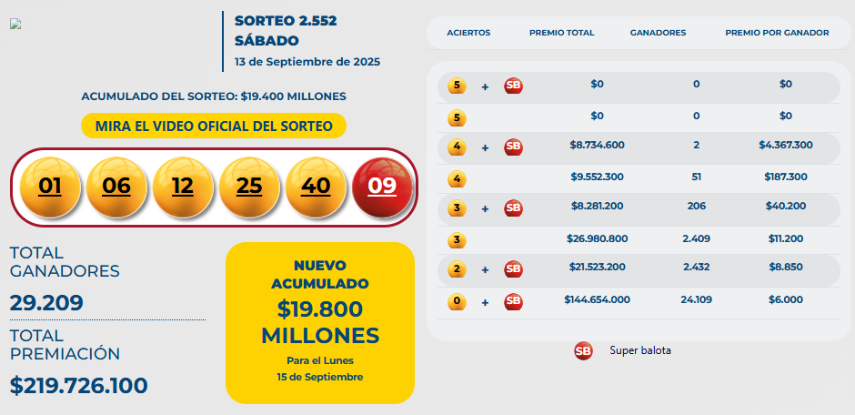 - Números ganadores: 01 – 06 – 12 – 25 – 40 – 09.