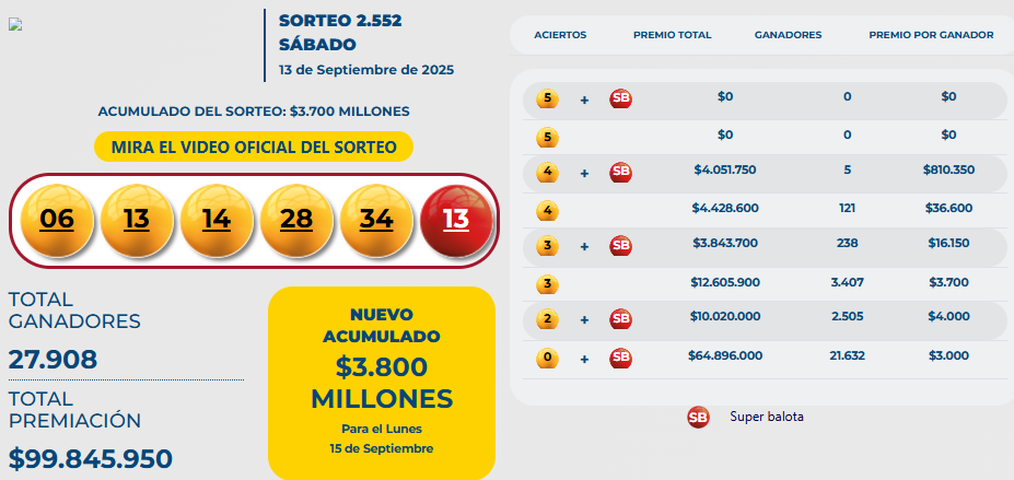 - Números ganadores: 06 – 13 – 14 – 28 – 34 – 13.