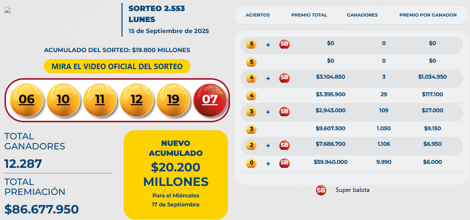 - Números ganadores: 06 – 10 – 11 – 12 – 19 – 07.