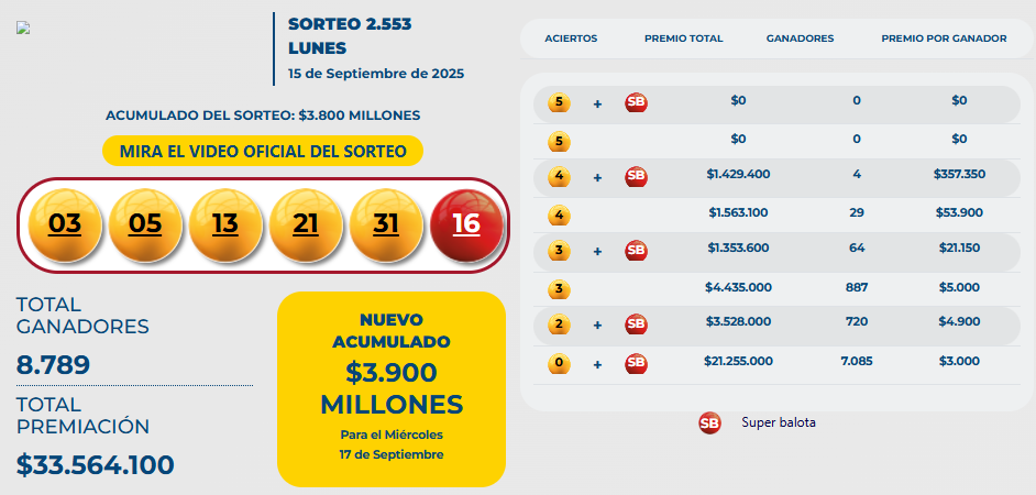 - Números ganadores: 03 – 05 – 13 – 21 – 31 – 16.