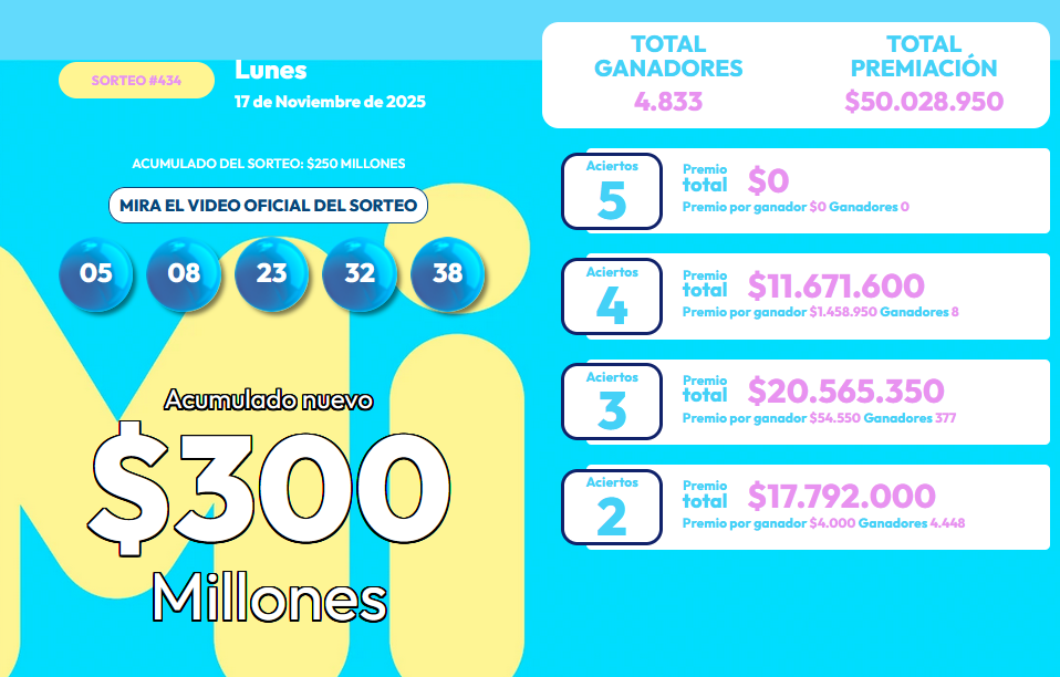 - Números ganadores: 05 – 08 – 23 – 32 – 38.