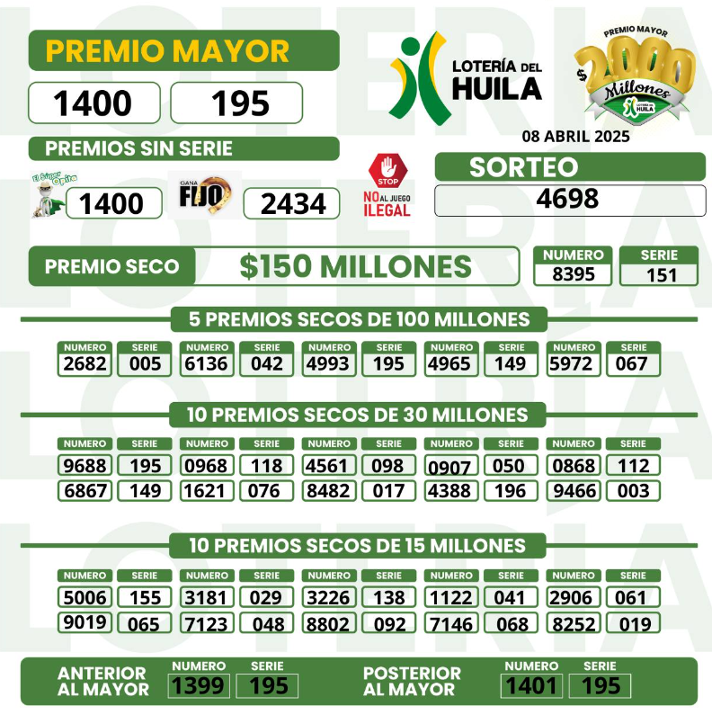 • Premio mayor: $2.000 millones de pesos.