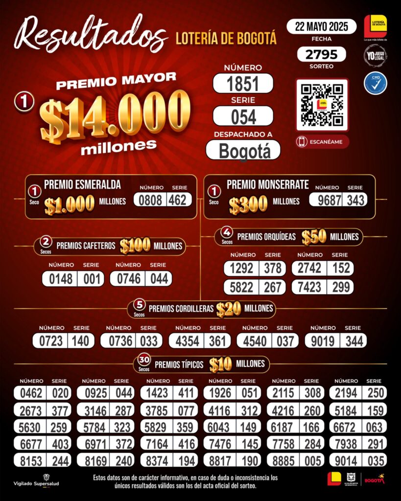 Resultados de las loterías de Bogotá, Quindío y Chontico Noche: números que cayeron y ganadores | 22 de mayo de 2025