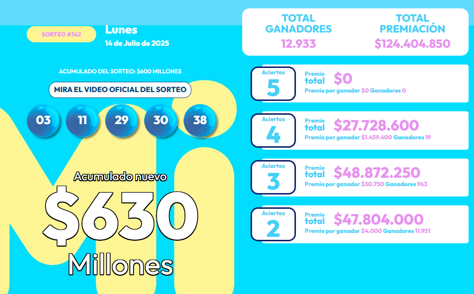 Resultados de MiLoto de este lunes 14 de julio de 2025: números ganadores de hoy
