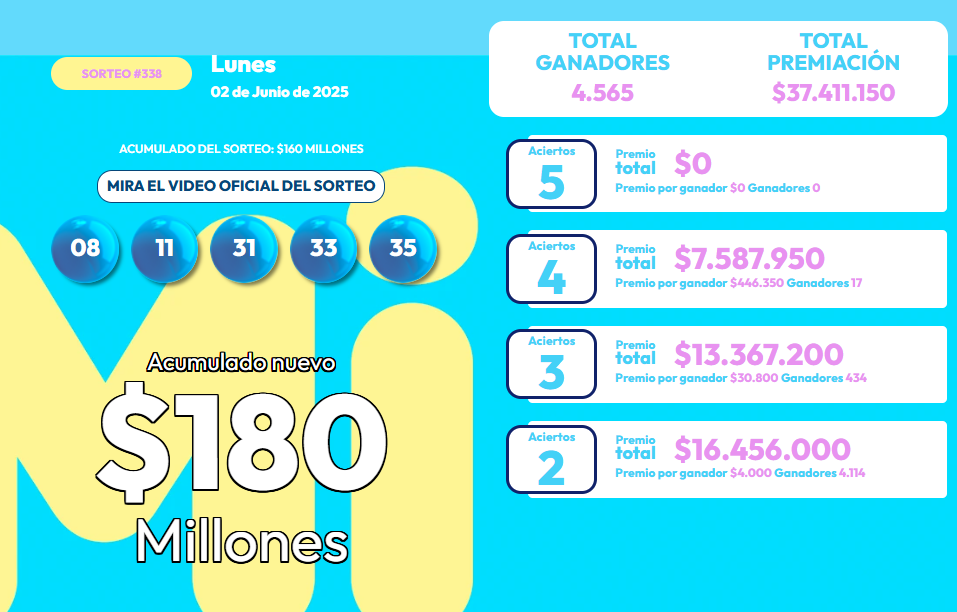 - Números ganadores: 08 – 11 – 31 – 33 – 35