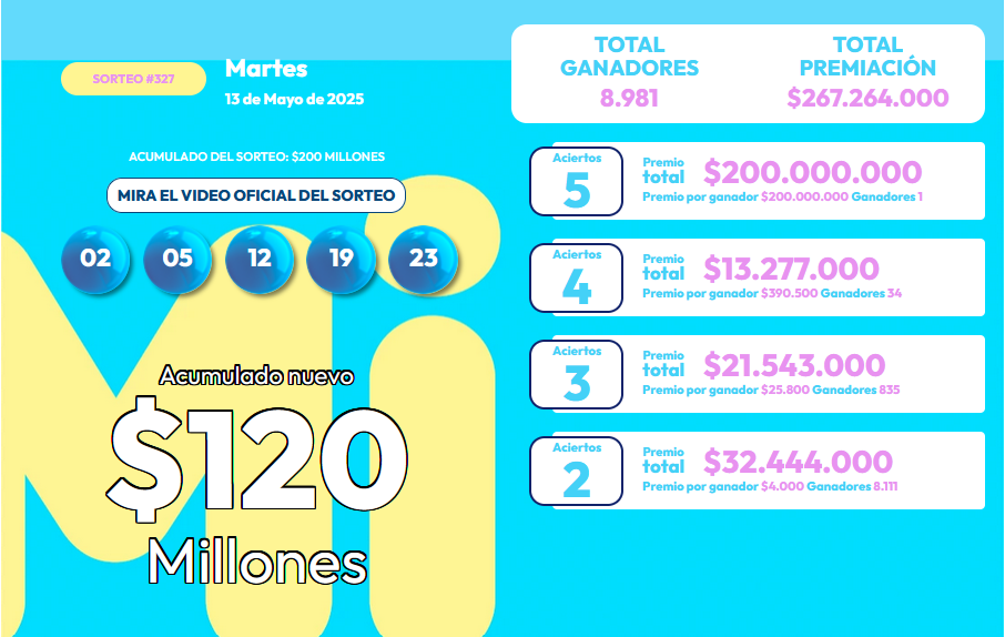- Números ganadores: 02 – 05 – 12 – 19 – 23.