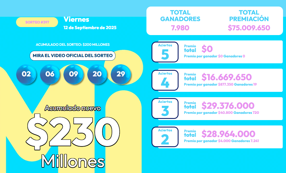 - Números ganadores: 02 – 06 – 09 – 20 – 29