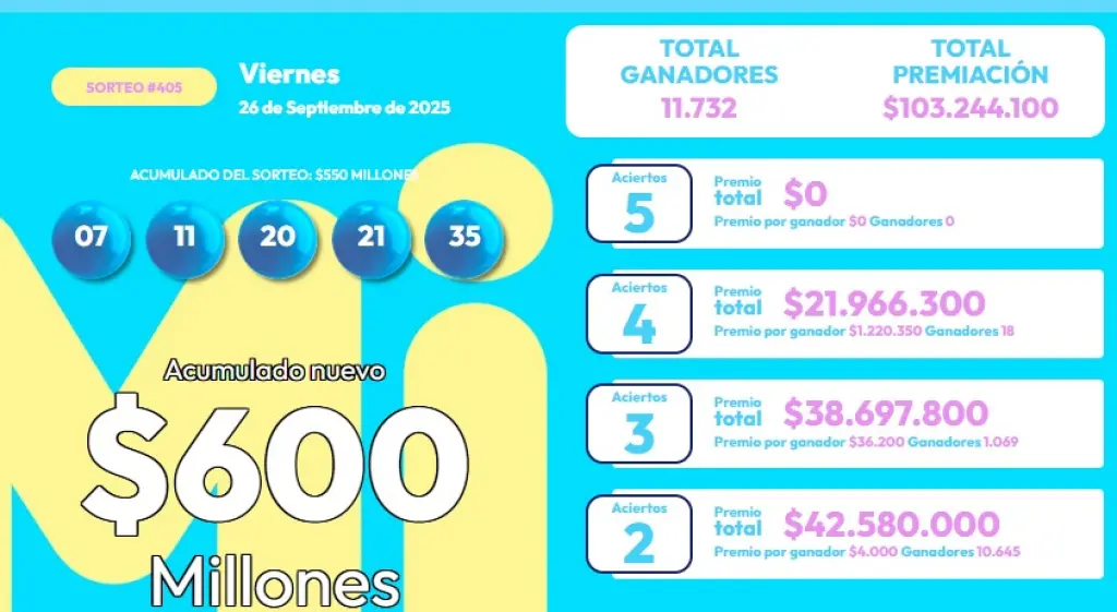 - Números ganadores: 07 – 11 – 20 – 21 – 35